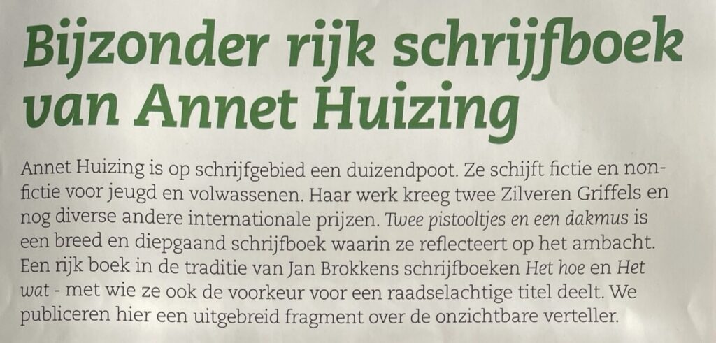 ‘Aan de hand van fragmenten uit volwassen literatuur laat Annet Huizing zien welke paden een schrijver moet of kan bewandelen om tot een volwaardig boek of verhaal te komen. Ze stelt zich daarbij kundig én bescheiden op en neemt je mee in haar gedachtegang over het schrijfproces. In de flaptekst omschreven als: ‘Ze doet daar niet hoogdravend of ingewikkeld over, maar onderzoekt nieuwsgierig de vele afslagen die je als schrijver kunt nemen bij het vertellen van een verhaal’. Moet je zelf schrijven om van dit boek te kunnen genieten? Zeker niet, ook wanneer je meer lezer dan schrijver bent is dit boek om van te smullen. Het laat je meteen anders kijken naar het eerstvolgende boek dat je openslaat.’